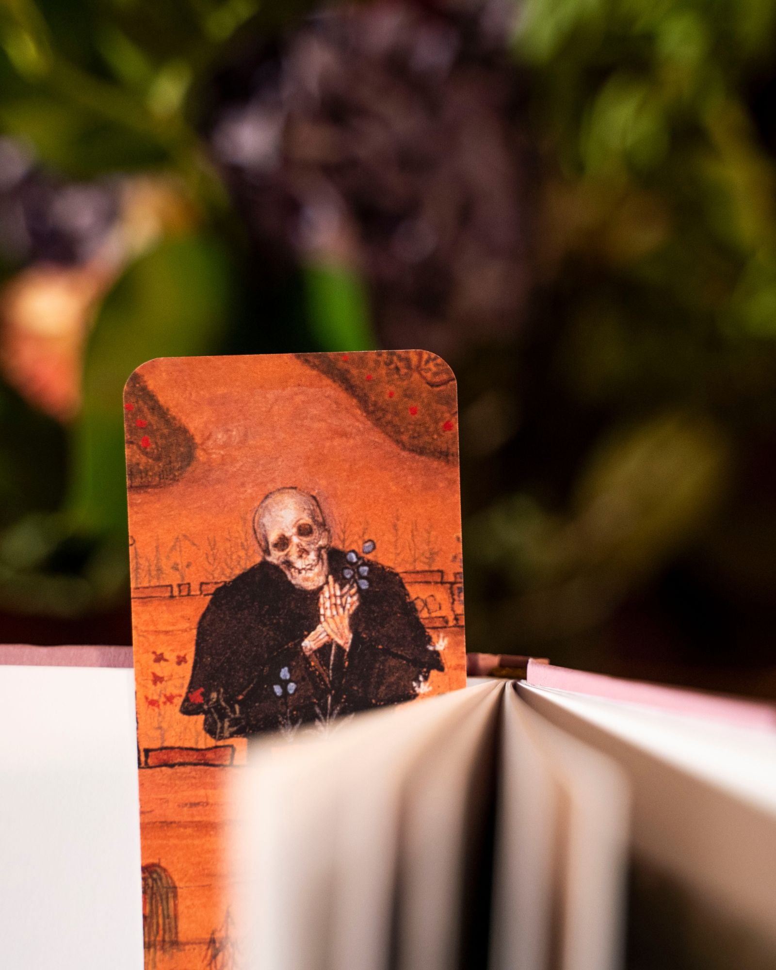 Käytä Kuoleman puutarha -kirjanmerkkiä ja jatka lukuhetkeä myöhemmin! Teoskuva Hugo Simbergin teoksesta Kuoleman puutarha sykähdyttää aina avatessasi kirjan.