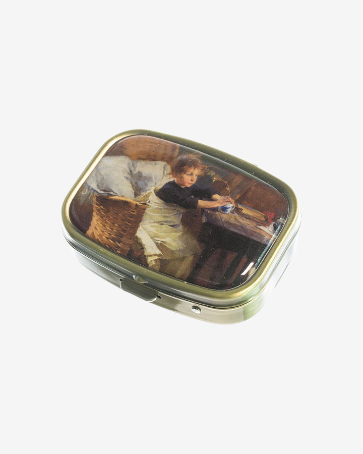 Kuljeta lääkkeet, vitamiinit tai pikkuesineet kätevästi Toipilas-pillerirasiassa! Viehättävä pillerirasia on myös näppärä matkamuisto tai tuliainen. Metallisen rasian kannessa on teoskuva Helene Schjerfbeckin maalauksesta Toipilas.
