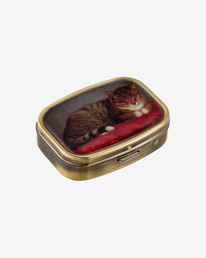 Kuljeta lääkkeet, vitamiinit tai pikkuesineet kätevästi Makaava kissa, Mosse -pillerirasiassa! Suloinen pillerirasia on myös näppärä matkamuisto tai tuliainen. Metallisen rasian kannessa on teoskuva Maria Wiikin maalauksesta Makaava kissa, Mosse.