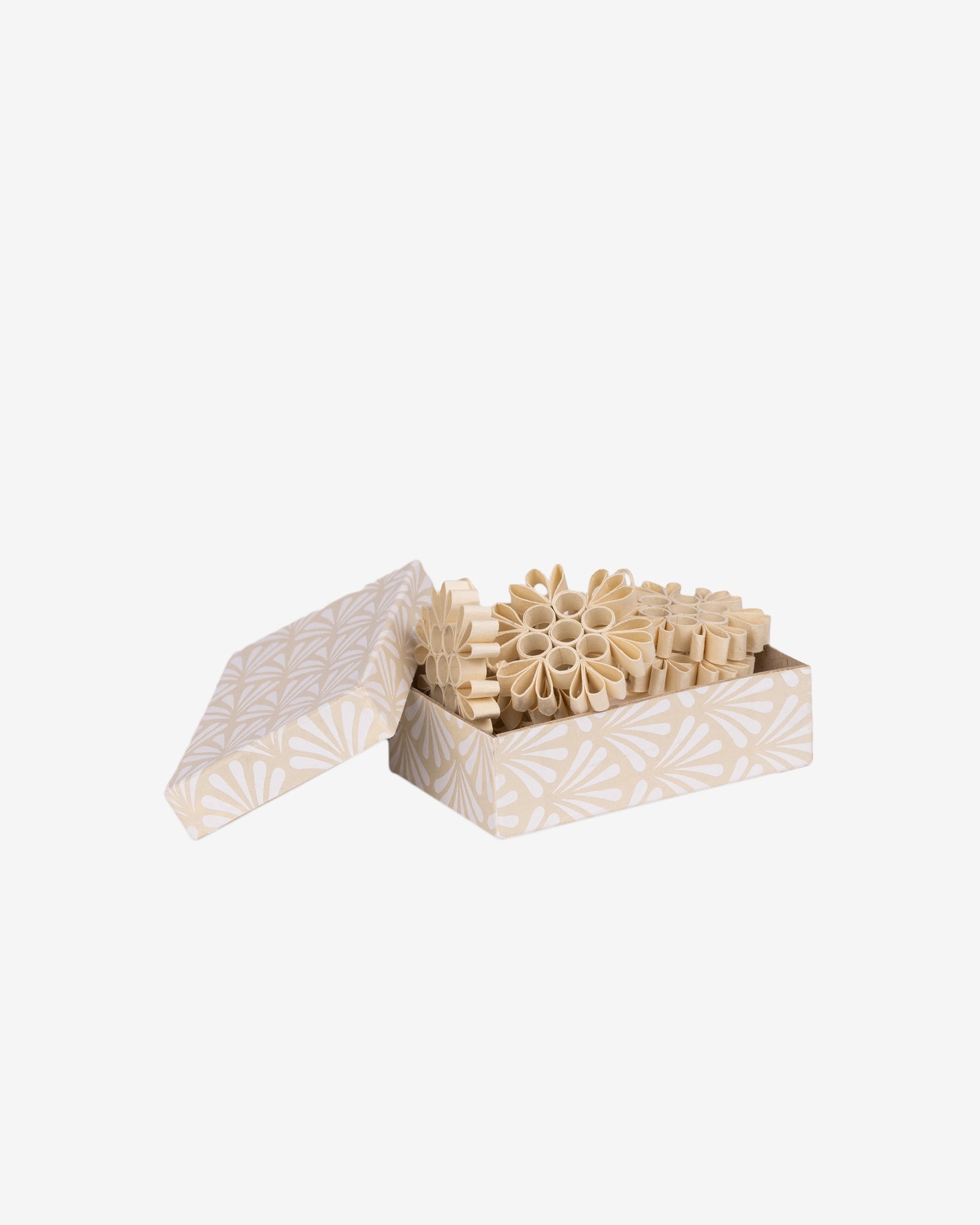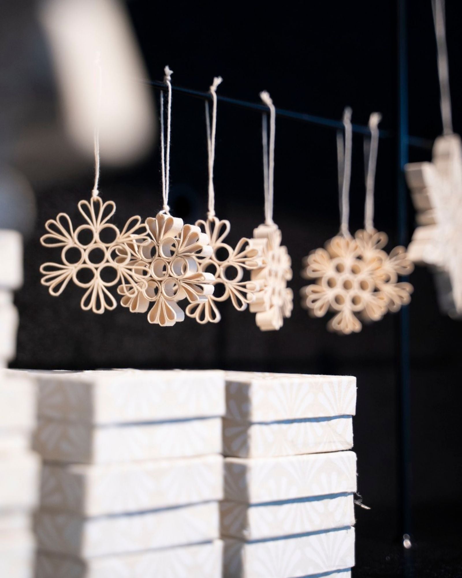 Ripusta herttaiset paperilumihiutaleet kuuseen tai oksalle luomaan talvista tunnelmaa. Pienet lumihiutalekoristeet sopivat myös lahjapakettien viimeistelyyn. Kauniiseen pahvirasiaan pakatut koristeet on valmistettu käsin ns. quilling-tekniikalla puuvillapaperisuikaileista. Paperituotteiden valmistus tukee naisten työllistymistä Bangladeshin maaseutualueilla.