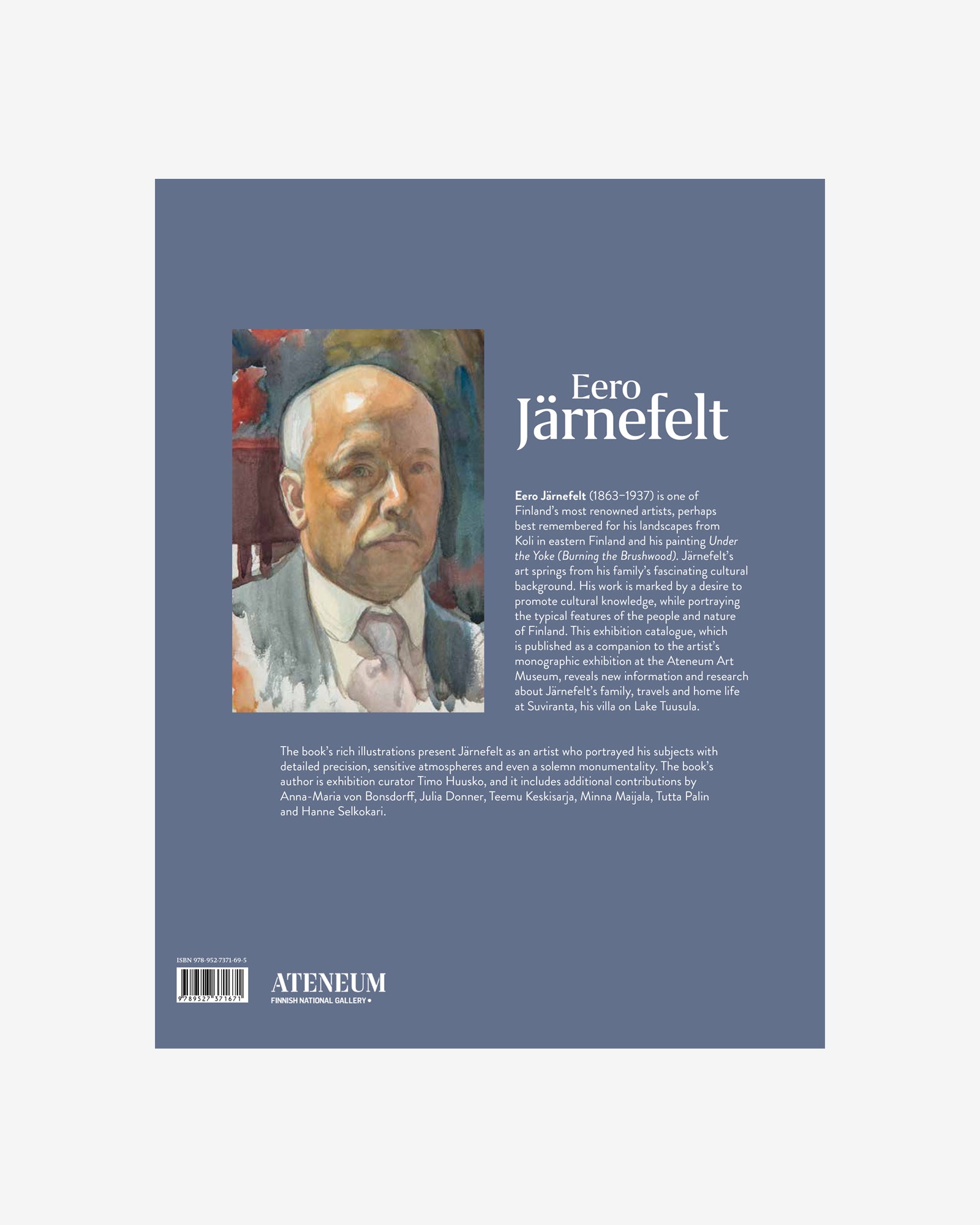 Eero Järnefelt (1863−1937) on tunnetuimpia suomalaisia taitelijoita. Erityisesti hänet muistetaan Koli-maisemista ja Raatajat rahanalaiset / Kaski –maalauksesta. Järnefeltin taide kumpuaa hänen kiinnostavan sukunsa kulttuuritaustasta. Hänen työskentelyään leimasi pyrkimys sivistyksen edistämiseen ja tyypillisten piirteiden kuvaamiseen yhtä lailla ihmisissä kuin luonnossa. Ateneumin näyttelyn yhteydessä julkaistava näyttelykirja tuo esiin uutta tietoa ja tutkimusta Järnefeltin suvusta, perheestä, matkoista ja hänen kotioloistaan Tuusulanjärven Suvirannassa.