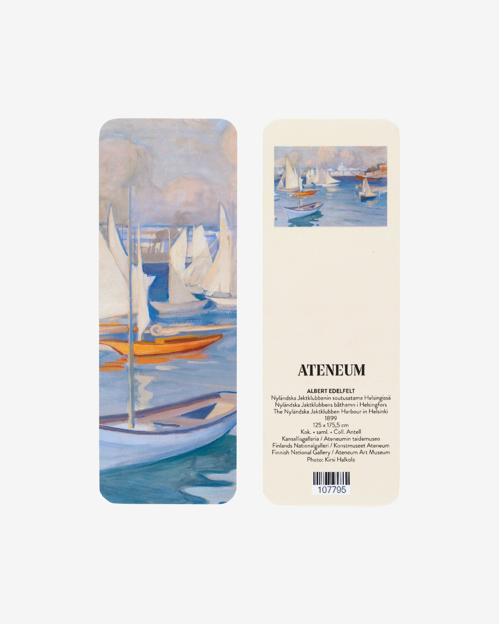 Käytä Nyländska Jaktklubben -kirjanmerkkiä ja jatka lukuhetkeä myöhemmin! Teoskuva Albert Edelfeltin maalauksesta Nyländska Jaktklubbenin soutusatama Helsingissä ilahduttaa aina avatessasi kirjan.