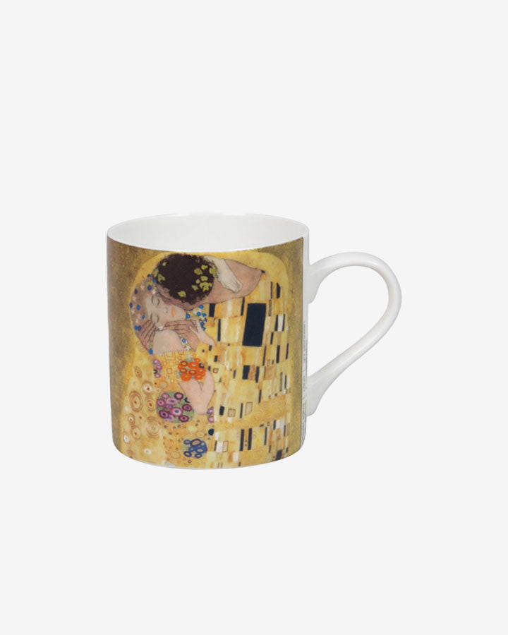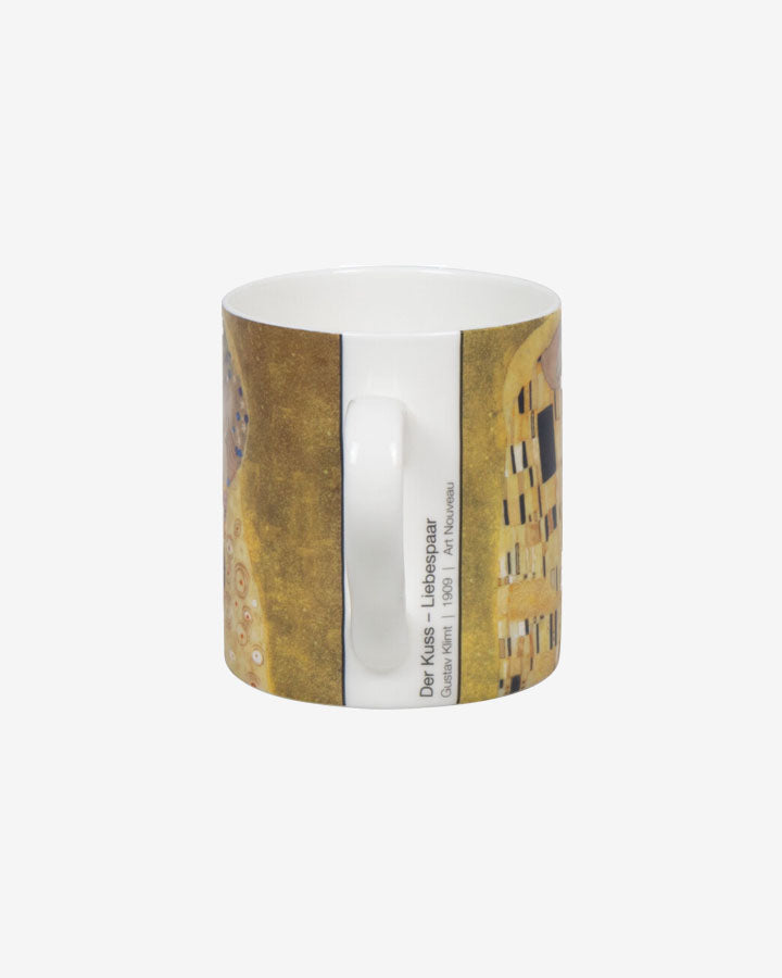Suudelma-posliinimuki tuo ripauksen luksusta jokaiseen kahvihetkeen! Tilavasta mukista maistuvat myös tee, kaakao ja muut kuumat juomat. Mukiin on painettu teoskuva Gustav Klimtin teoksesta Suudelma, jonka värit toistuvat kauniisti luuposliinin pinnalla.