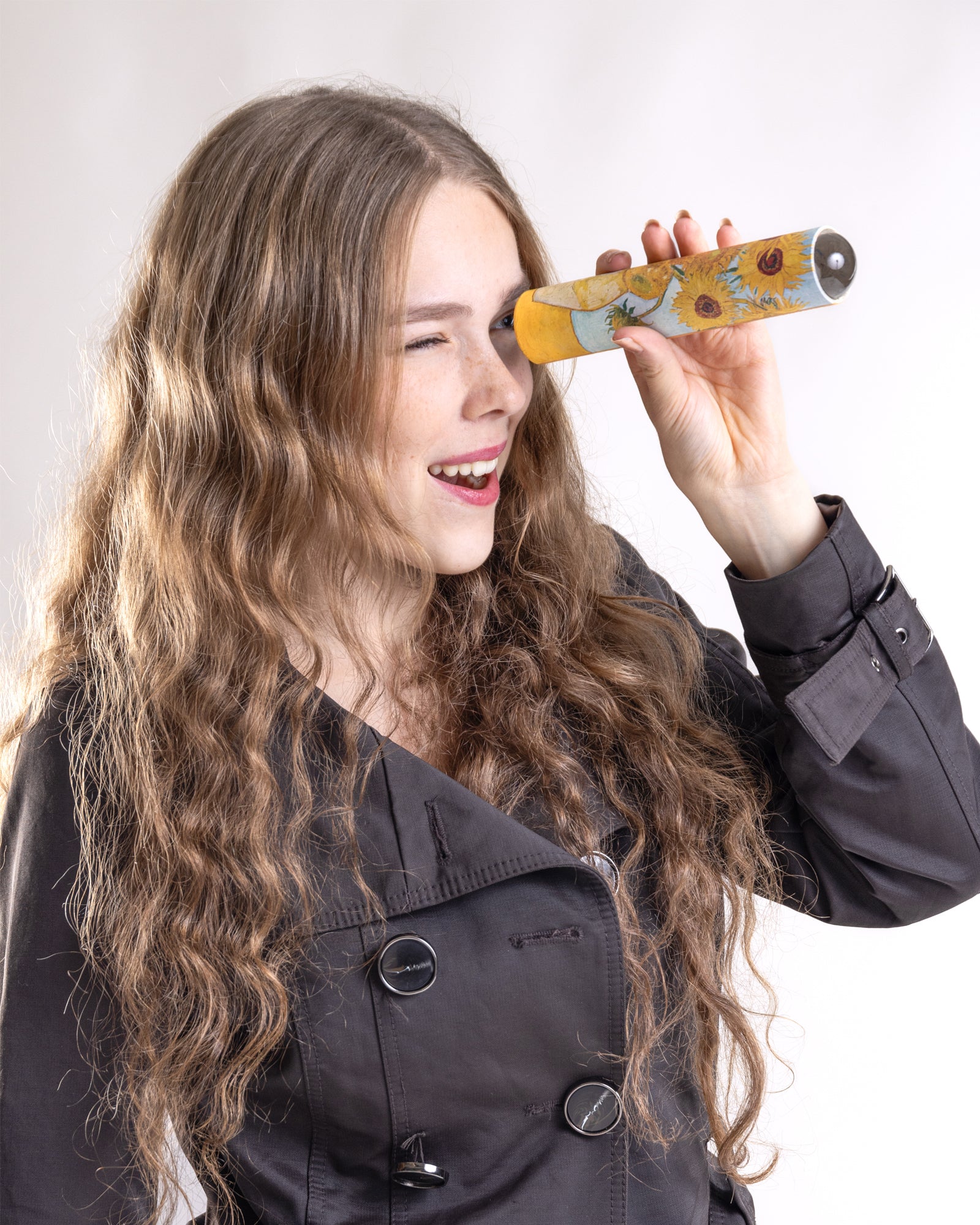 Kurkista kaleidoskoopin läpi ja näe maailma uudella tavalla! Auringonkukkia-kaleidoskooppi muuttaa ympäristön jännittäväksi muotojen ja värien leikiksi. Sopii niin pienelle kuin isommallekin tutkijalle. Kaleidoskoopin jämäkässä kartonkirungossa on kuva Vincent van Goghin teoksesta Auringonkukkia.