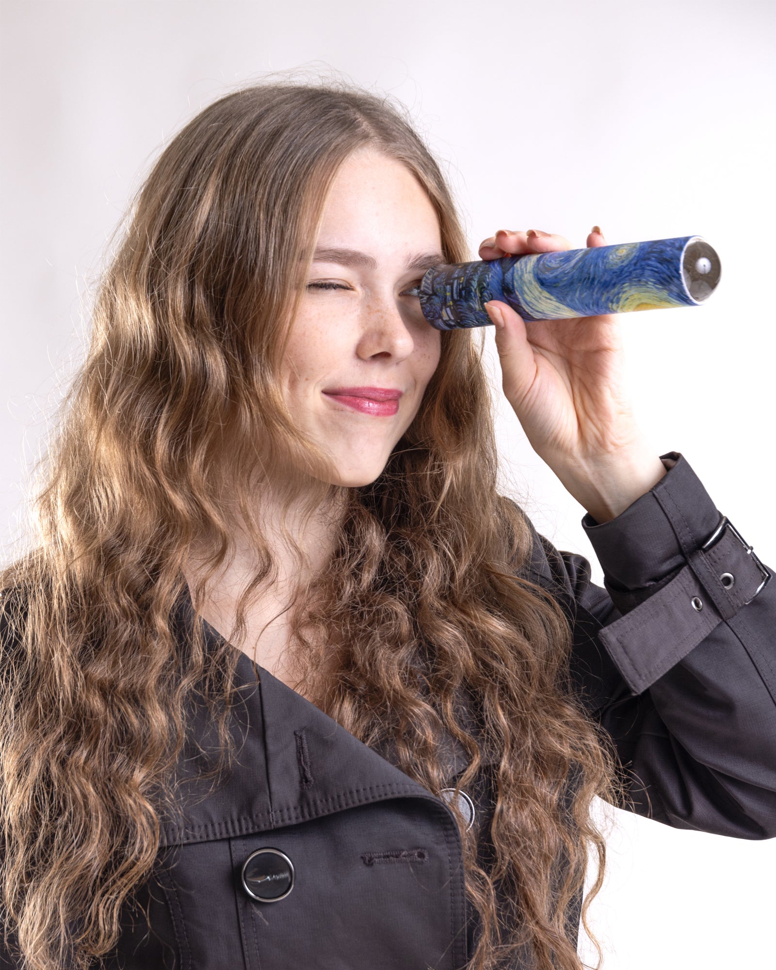 Kurkista kaleidoskoopin läpi ja näe maailma uudella tavalla! Tähtikirkas yö -kaleidoskooppi muuttaa ympäristön jännittäväksi muotojen ja värien leikiksi. Sopii niin pienelle kuin isommallekin tutkijalle. Kaleidoskoopin jämäkässä kartonkirungossa on kuva Vincent van Goghin teoksesta Tähtikirkas yö.