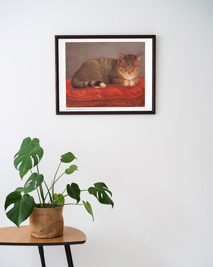 Luo kotiisi uutta tunnelmaa Makaava kissa, Mosse -julisteella! Kuva Maria Wiikin teoksesta Makaava kissa, Mosse on painettu laadukkaalle paperille Virossa.