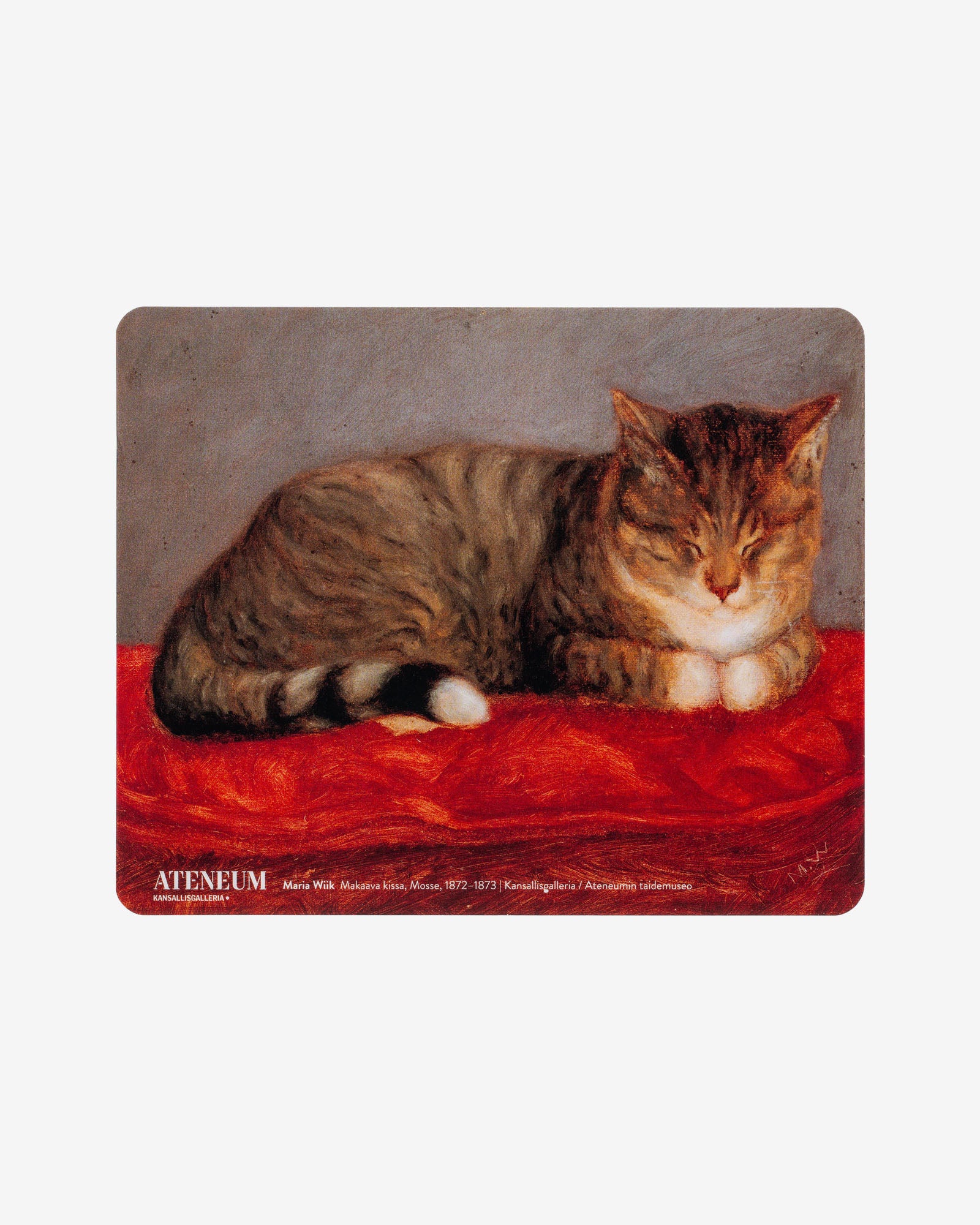 Piristä työpöytääsi Makaava kissa, Mosse -hiirimatolla! Suloisella alustalla hiirikin liikkuu sulavammin. Hiirimatossa on liukumaton pohja ja päällä teoskuva Maria Wiikin maalauksesta Makaava kissa, Mosse.