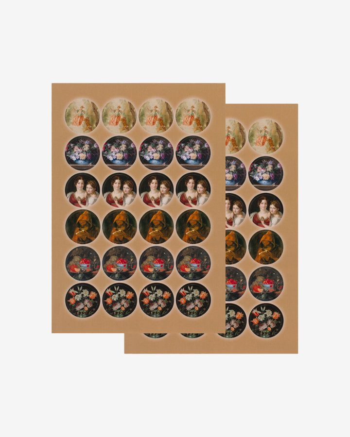 Sinebrychoffin taidemuseo -tarra-arkissa on kuvia Sinebrychoffin taidemuseon kokoelmien teoksista. Tarrat sopivat esimerkiksi askarteluun, koristeluun ja bujoiluun.