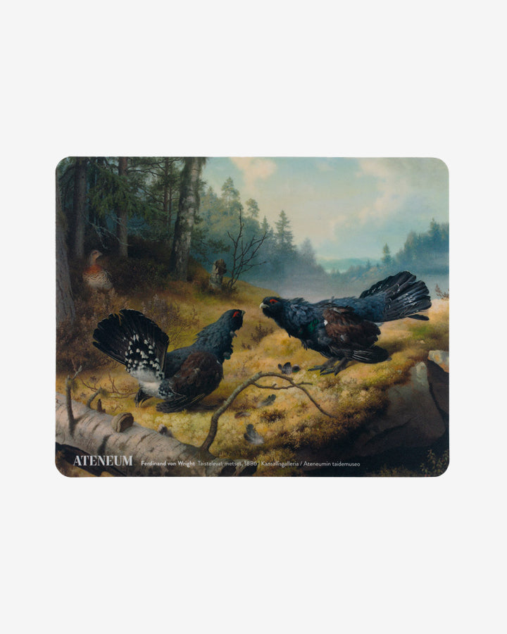 Päivitä työpöytäsi Taistelevat metsot -hiirimatolla! Tyylikkäällä alustalla hiirikin liikkuu sulavammin. Hiirimatossa on liukumaton pohja ja päällä teoskuva Ferdinand von Wrightin maalauksesta Taistelevat metsot.