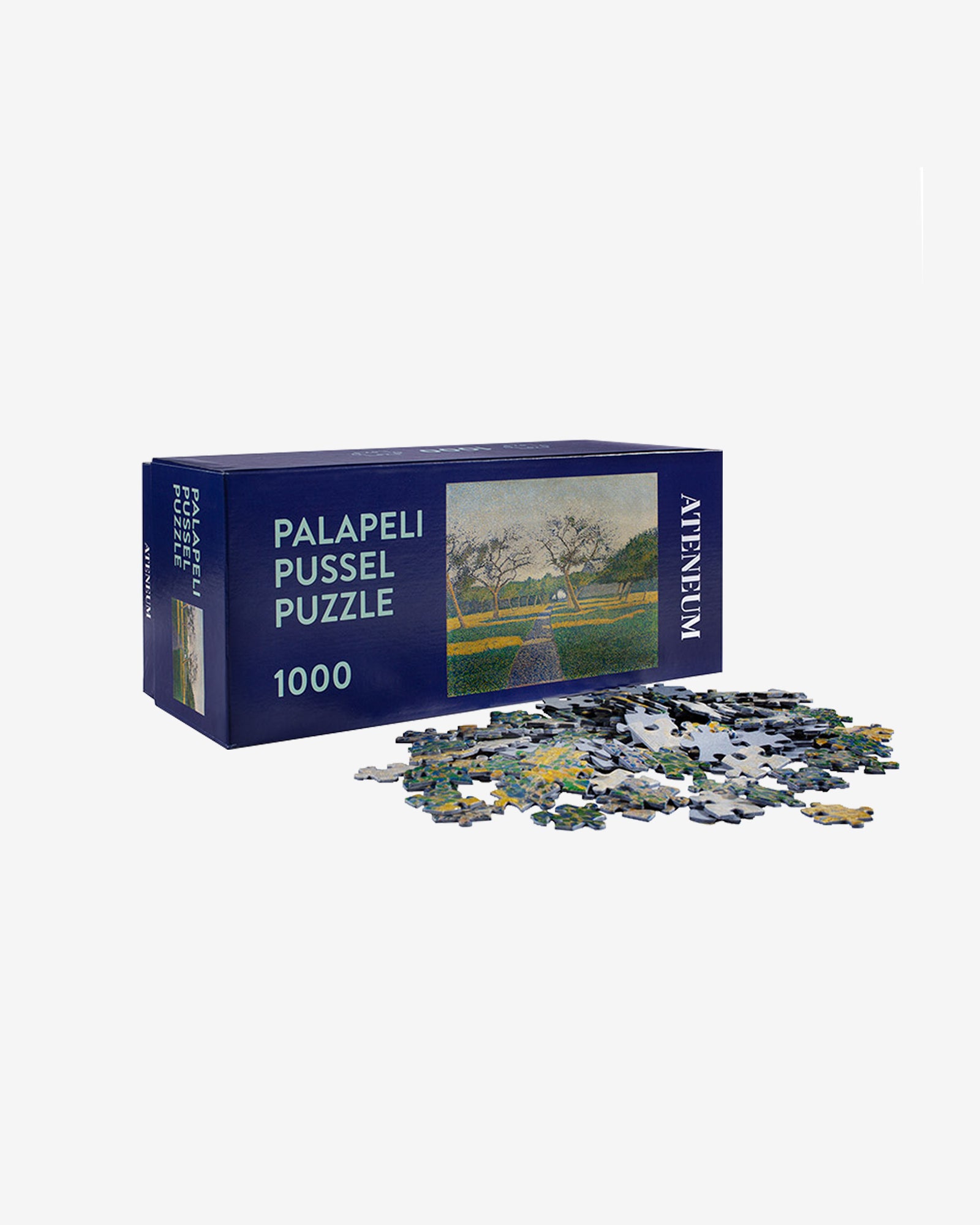 Tämä tuhannen palan palapeli tarjoaa tekemistä useammaksikin koti-illaksi! Palapelin kokoaminen on hauskaa niin yksin kuin yhdessä ystävien tai perheenjäsenien kanssa. Aherrus palkitaan, sillä lopputuloksena on teoskuva Alfred William Finchin maalauksesta Hedelmäpuutarha La Louvièrestä.
