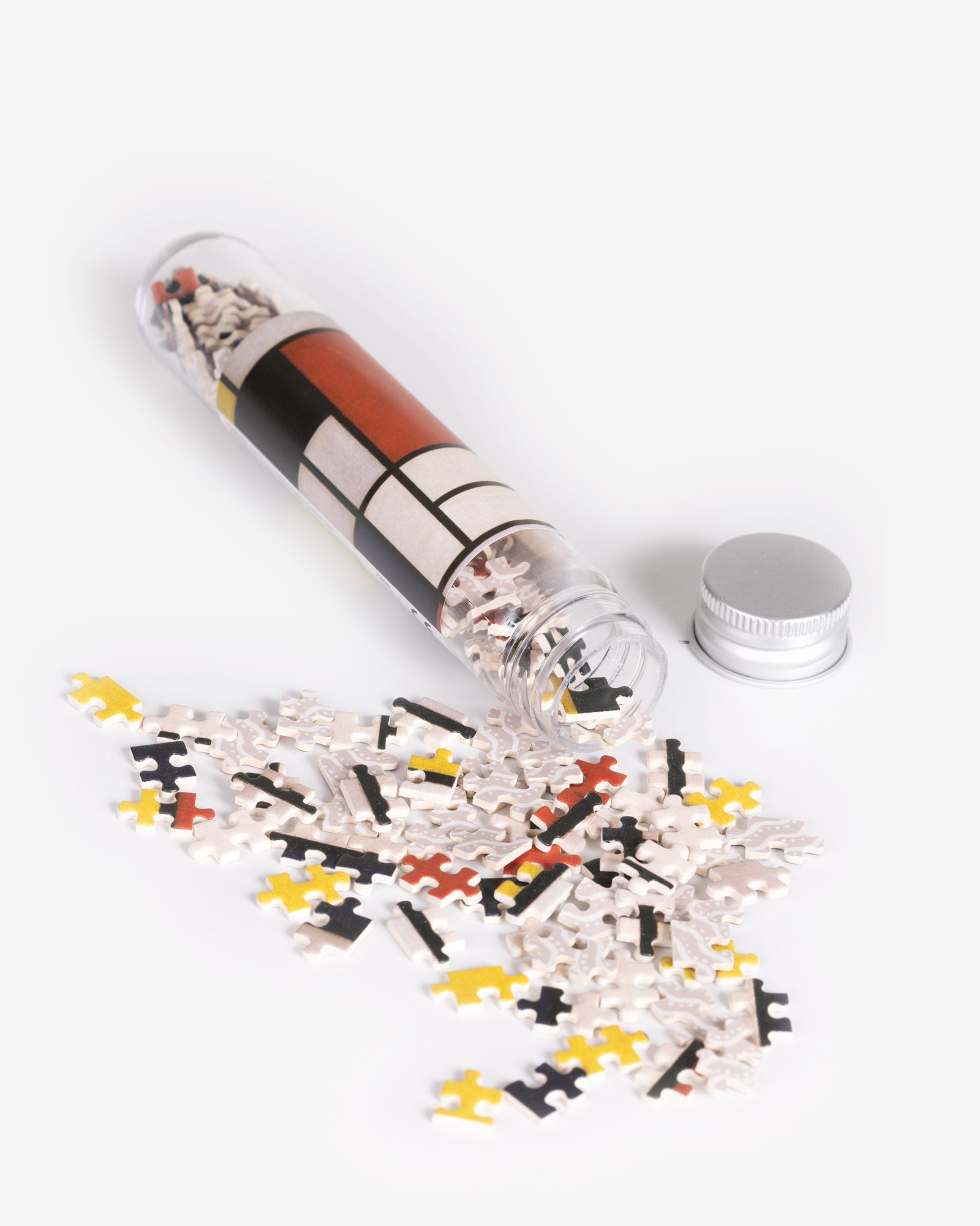 Nappaa Kompositio-minipalapeli mukaan ajanvietteeksi minne tahansa! Matkakokoinen palapeli on pakattu pieneen "koeputkeen", ja siinä riittää haastetta noin tunniksi tai pariksi. Lopputuloksena on teoskuva Piet Mondrianin teoksesta Composition with Red Yellow Blue and Black.