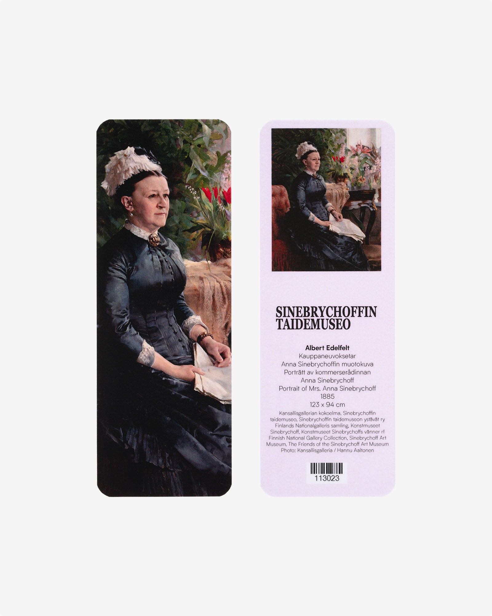 Käytä Anna Sinebrychoffin muotokuva -kirjanmerkkiä ja jatka lukuhetkeä myöhemmin! Teoskuva Albert Edelfeltin maalauksesta Kauppaneuvoksetar Anna Sinebrychoffin muotokuva piristää aina avatessasi kirjan.