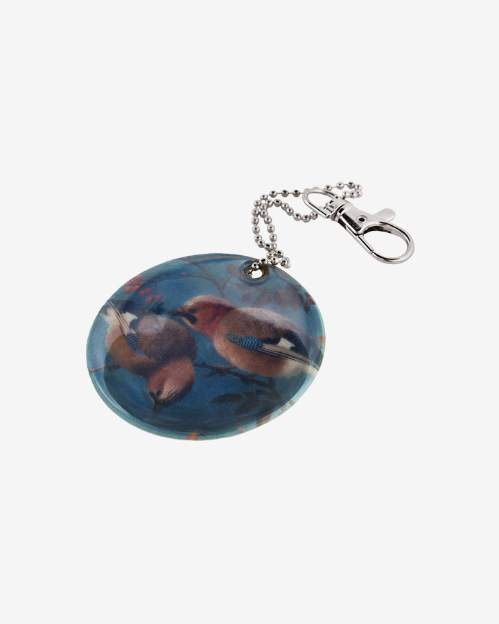 Erotu pimeässä tyylikkäällä Närhiä-heijastimella! Pyöreässä heijastimessa on kuva Ferdinand von Wrightin maalauksesta Närhiä, toisella puolella on Ateneumin logo.