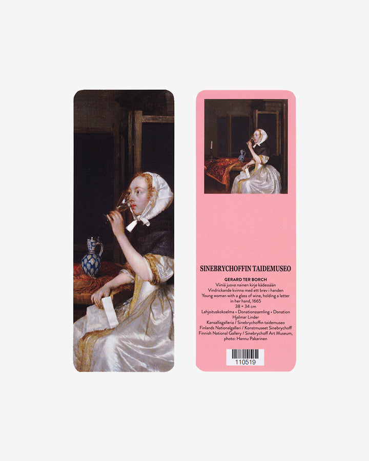 Käytä Viiniä juova nainen kirje kädessään -kirjanmerkkiä ja jatka lukuhetkeä myöhemmin! Teoskuva Gerard ter Borchin maalauksesta Viiniä juova nainen kirje kädessään ilahduttaa aina avatessasi kirjan.