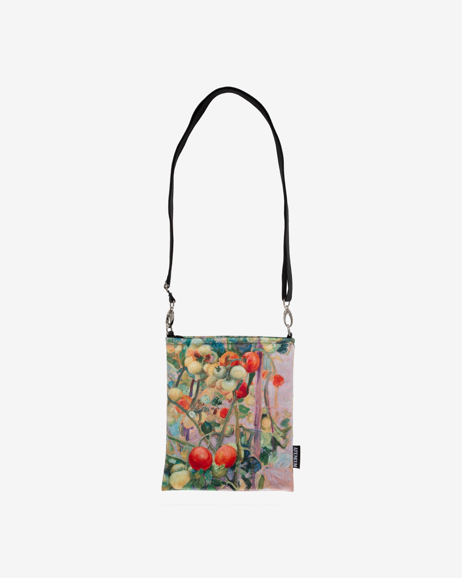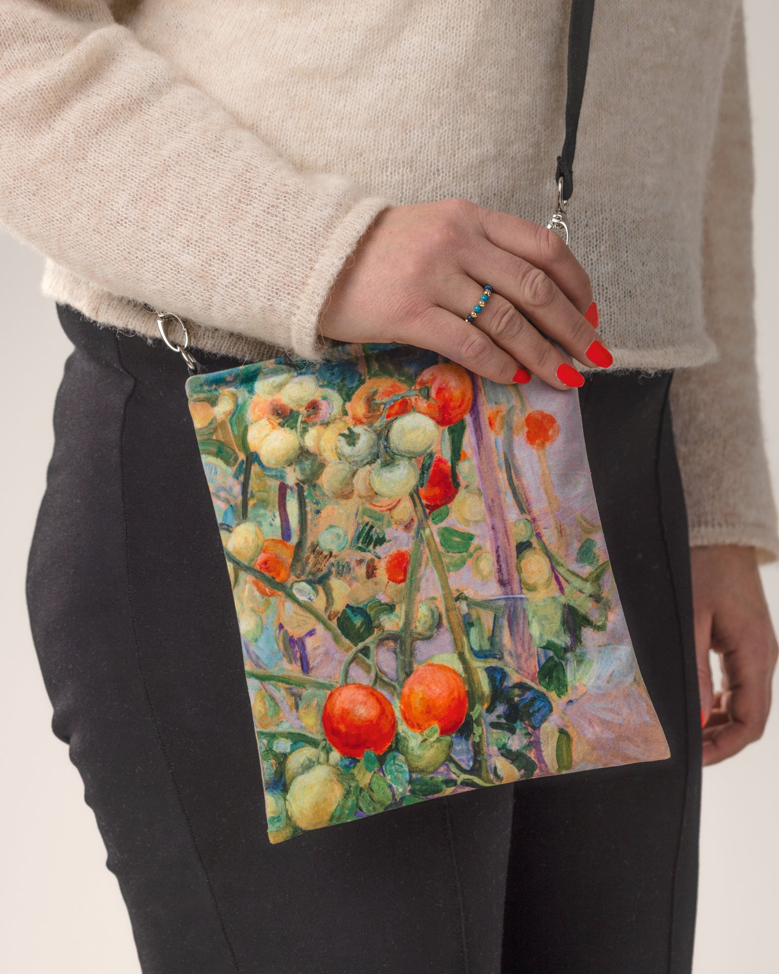 This practical accessory features an adjustable strap and a delightful velvet surface. The bag closes with a zipper and has an inner pocket for your small essentials. The fabric pattern is inspired by the work Tomatoes by Pekka Halonen.