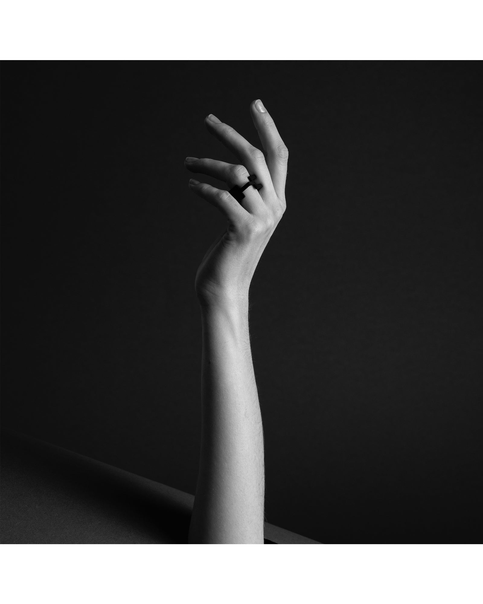The Duality rings are inspired by architecture. The Kimura ring draws its inspiration from the Scape House, designed by the Japanese architectural firm FORM Kimura Architects. Known for their focus on residential buildings, the studio specializes in Japanese architecture that explores the interplay of light and shadow, varying ceiling heights, and contrasting materials. The ring’s minimalist yet striking form shifts in appearance depending on how you wear it on your finger.
