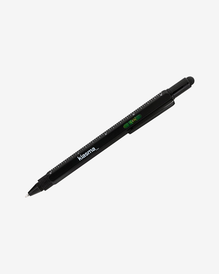 Kiasma multipurpose pen is a handy tool for many everyday situations. The hexagonal pen features a spirit level, screwdriver, touchscreen tip, and various measurement scales. A white Kiasma logo is printed on the side of the black pen.