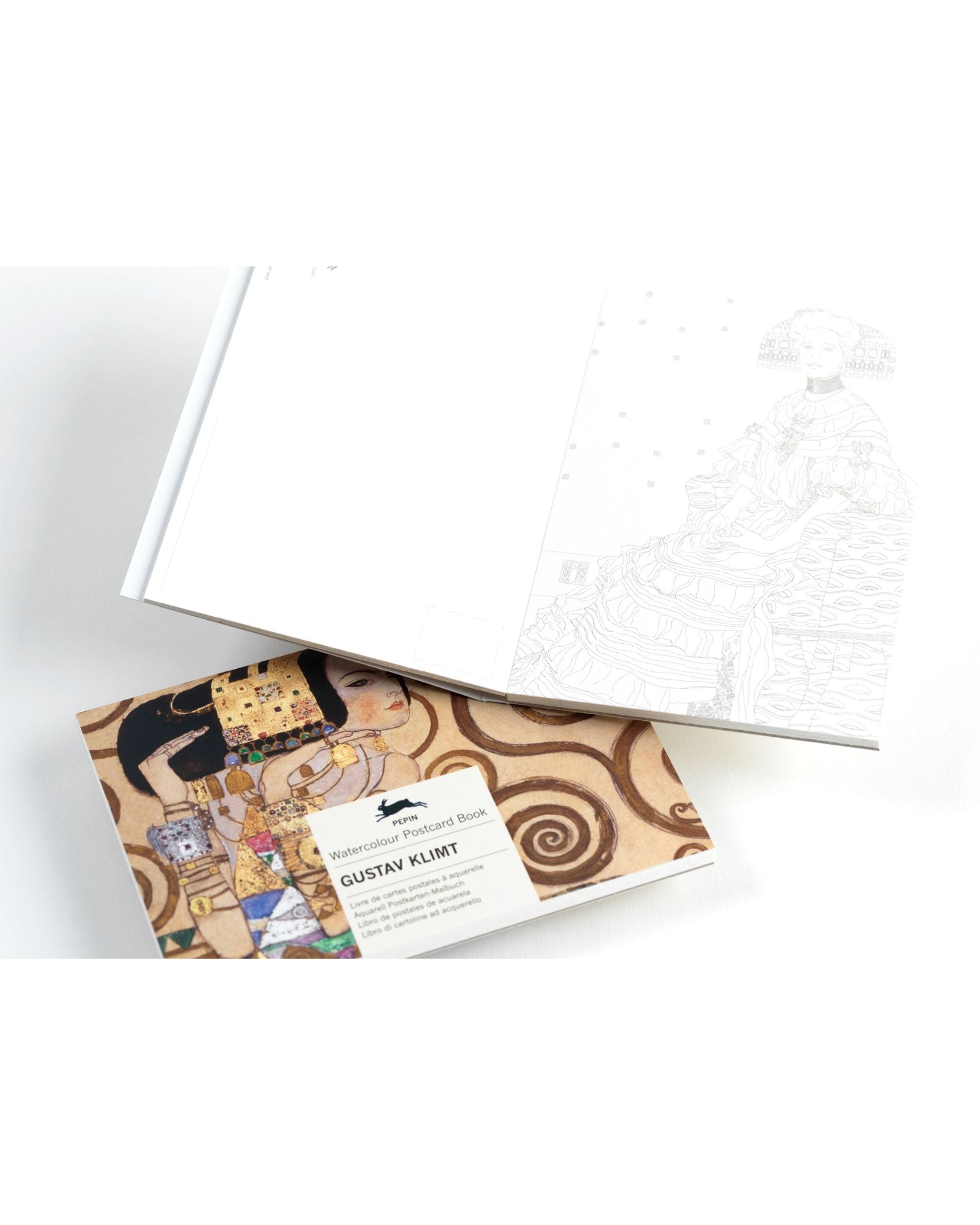 Luo omat postikorttisi Klimtin tyyliin! Laadukas, postikorttikokoinen akvarellikirja sisältää 16 väritettävää kuvaa Gustav Klimtin teoksista. Paksu vesiväripaperi soveltuu myös tusseilla, puuväreillä ja vahaliiduilla värittämiseen.