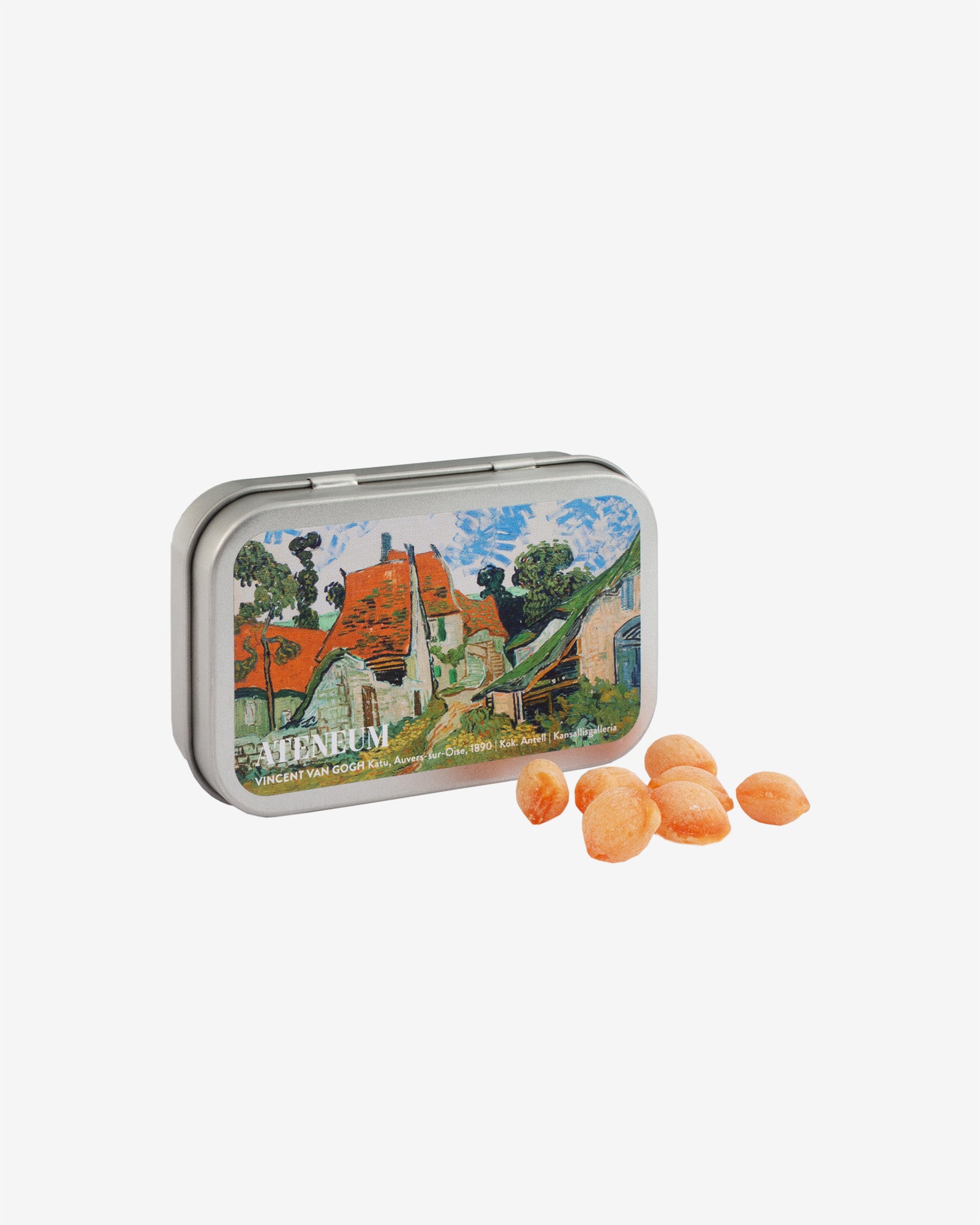 Katu, Auvers-sur-Oise -appelsiinipastillit tarjoavat pientä arjen iloa itselle ja ystävälle! Kauniisen metallirasiaan pakatut, appelsiininmakuiset pastillit saavat suun makeaksi. Rasian kannessa on teoskuva Vincent van Goghin maalauksesta Katu, Auvers-sur-Oise.