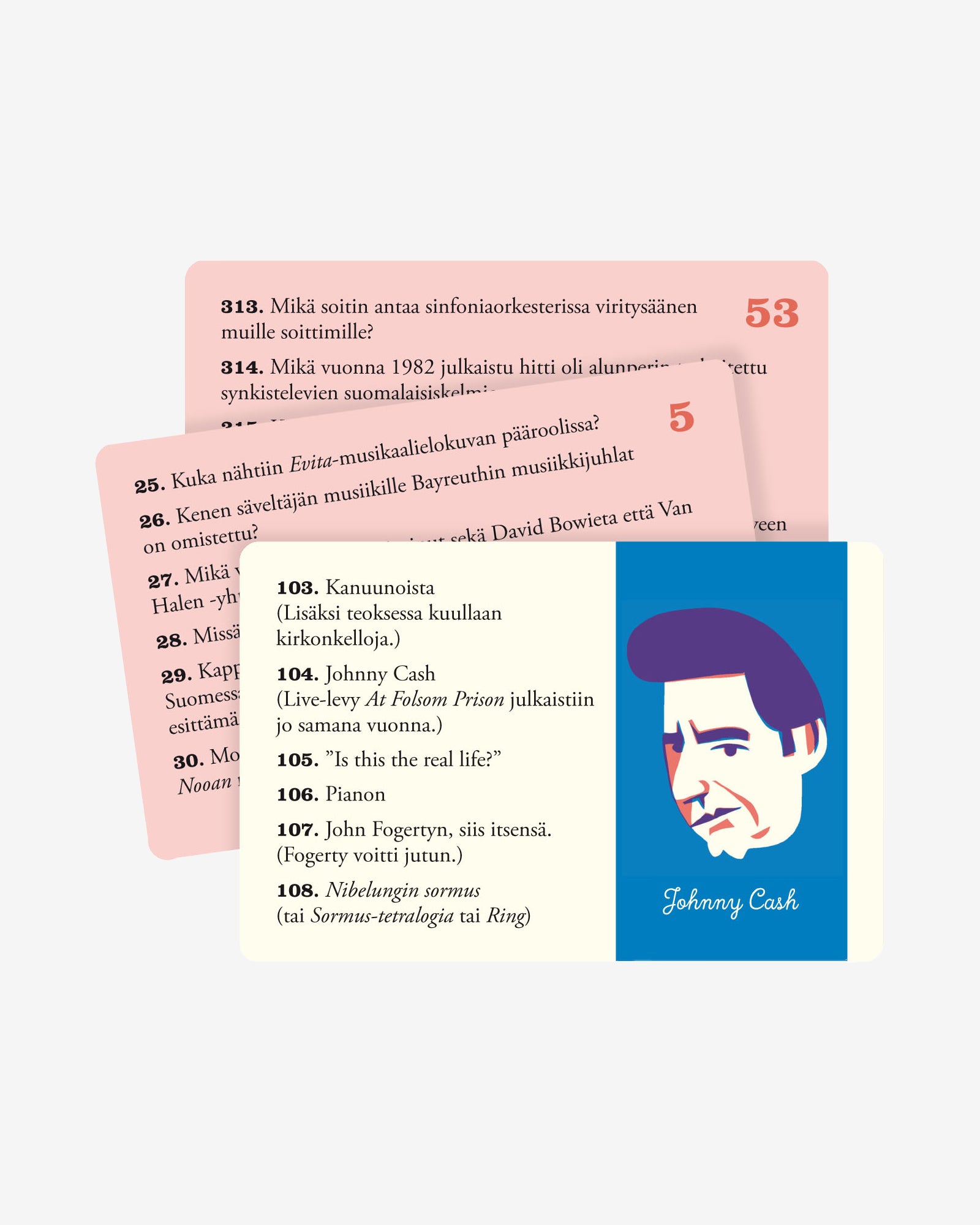 Kehvolan Musiikki-kysymyskortit sisältävät 324 tietokilpailukysymystä rokista klassiseen ja jazzista iskelmään. Vastaukset kortin kääntöpuolella. Kuvituksena kysymyksiin liittyvien muusikoiden potretteja.