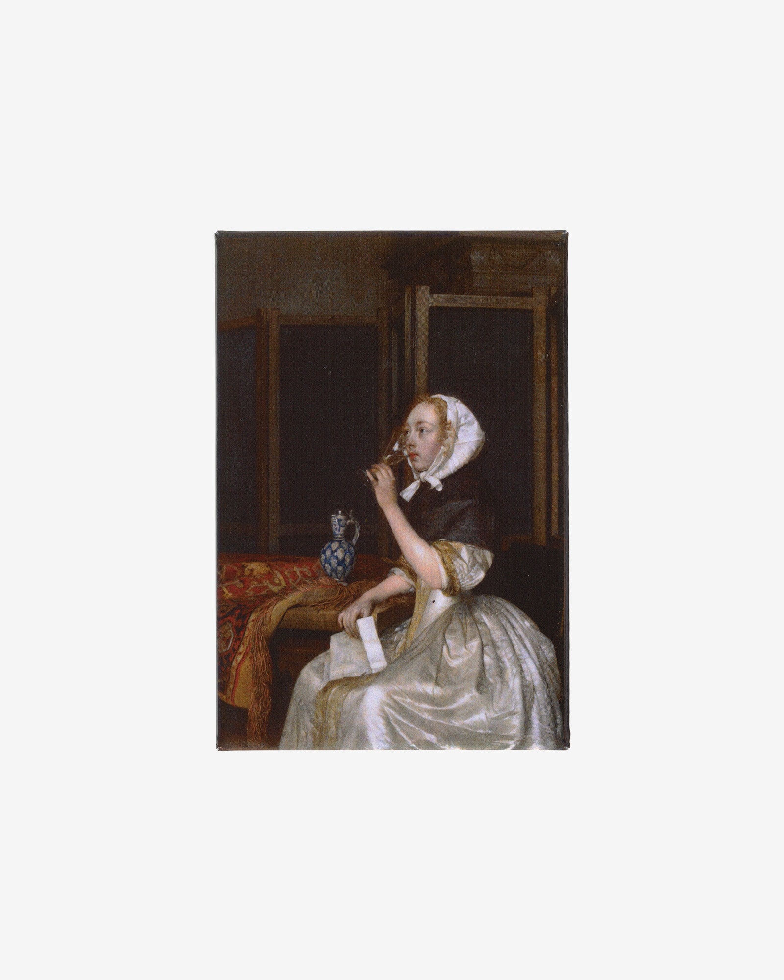 Magneetti on näyttely- ja matkamuistojen klassikko! Yllätä taiteen ystävä pienellä lahjalla tai kokoa magneeteista oma galleria jääkaapin oveen. Magneetissa on teoskuva Gerard ter Borchin maalauksesta Viiniä juova nainen kirje kädessään.